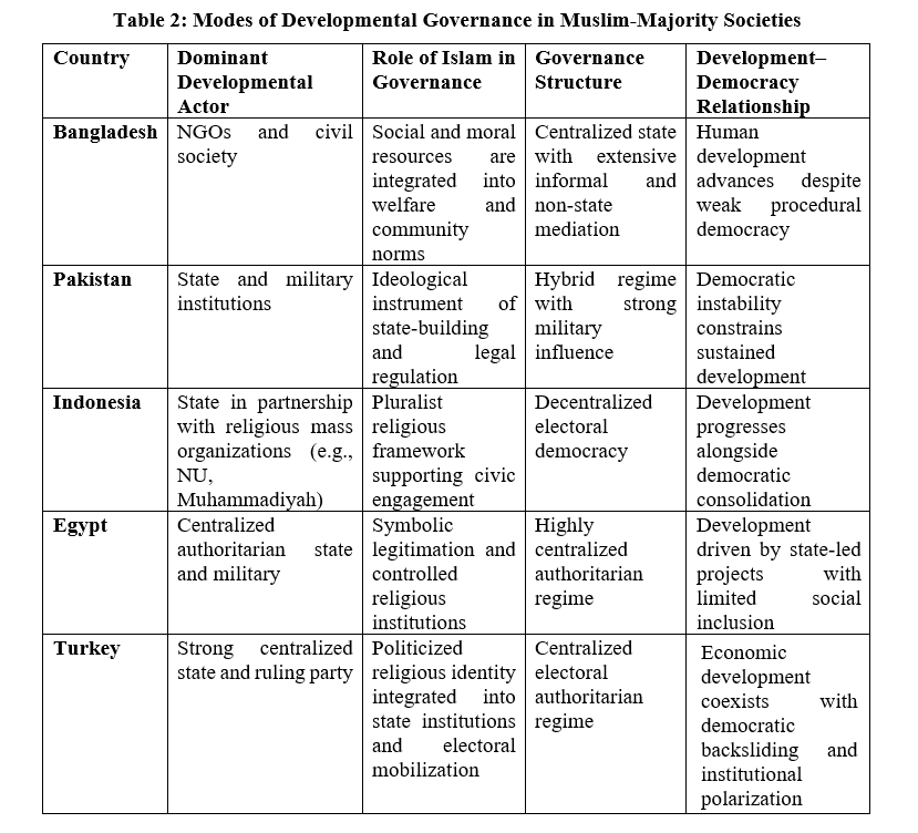 This comparative analysis signifies that neither state power nor authoritarian rule alone determines developmental outcomes in Muslim-majority countries. Bangladesh exemplifies how socially ingrained religion can offset deficient formal institutions, facilitating human growth via negotiated and community-driven religious practices. In contrast, Turkey and more notably Egypt, exemplify how the institutionalization of religion inside a robust state may coexist with economic advancement while eroding democratic pluralism. These disparities underscore that the political and developmental impacts of Islam are influenced more by institutional setting and governance methods than by dogma. The following Table 2 delineates the types of developmental governance in Muslim-majority countries, emphasizing how differences in state capability, civil society involvement, and the political influence of Islam all shape the varied development-democracy configurations.