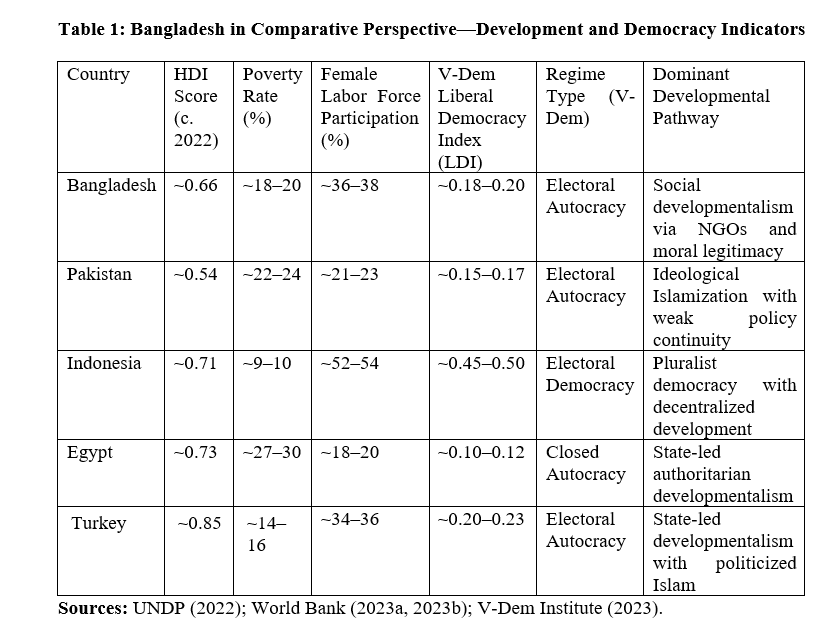 The development and governance trajectory of Bangladesh becomes clearer when analyzed comparatively. It demonstrates how Muslim-majority societies uniquely navigate the relationship among Islam, development, and democracy.