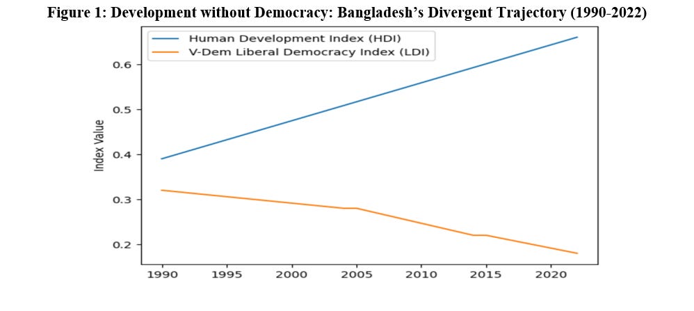 Bangladesh is an analytically significant outlier in this study. Even though democracy is still shaky, authoritarianism is on the rise, and institutions are rarely get held to account, the country has made great strides in human development, such as reducing poverty, improving health services, and increasing women’s education and participation in the workforce (Mostofa & Subedi, 2021; World Bank, 2023a; UNDP, 2022). Even with all the political turbulence, the country has attained significant progress in human development metrics (World Bank, 2023a; UNDP, 2022). The coexistence of developmental progress and democratic stagnation really challenges the traditional idea on the essential role of liberal-democratic institutions in fostering social and economic developments.