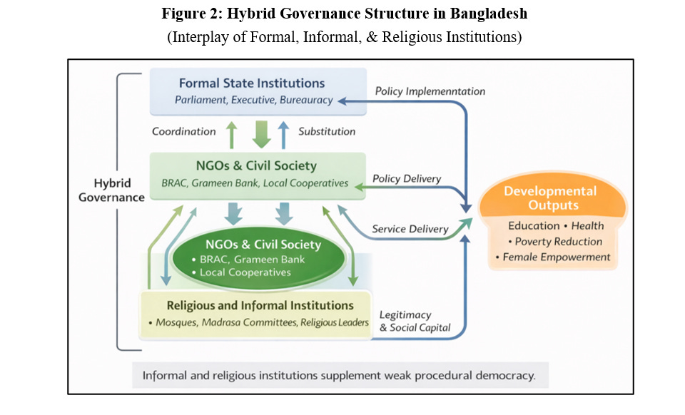 Third, Bangladesh exemplifies how civil society can substitute for weak state institutions, facilitating governance and providing public goods in sectors such as health, education, and microfinance. NGOs such as BRAC and Grameen Bank have emerged as quasi-institutional entities, connecting the state with local communities and cultivating social trust. This paradigm enhances developmental outcomes but involves democratic compromises. Dependence on informal governance networks and religiously legitimated moral authority can bypass official accountability mechanisms, so entrenching elite supremacy and limiting citizen engagement in decision-making (Levitsky & Way, 2010; Riaz & Fair, 2010).