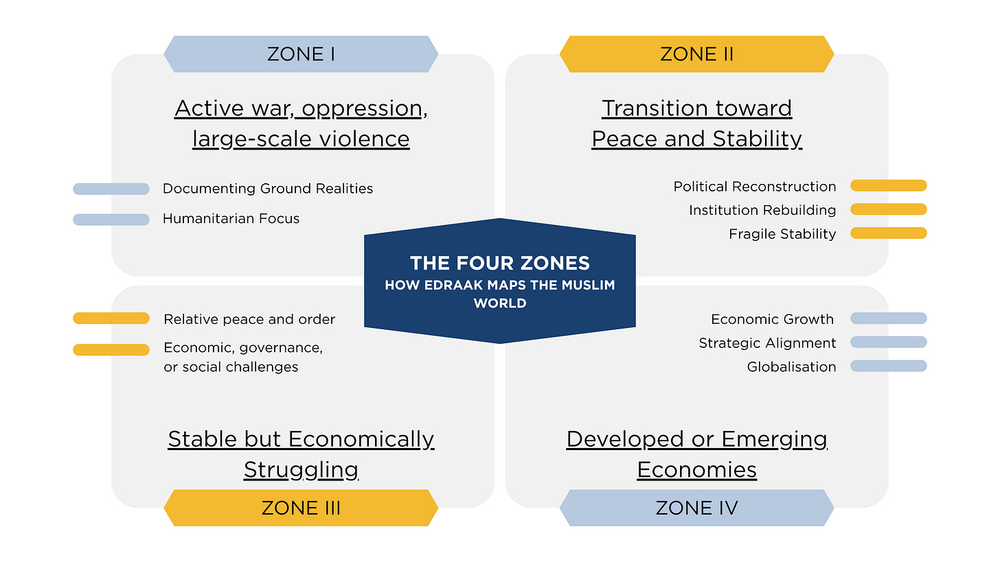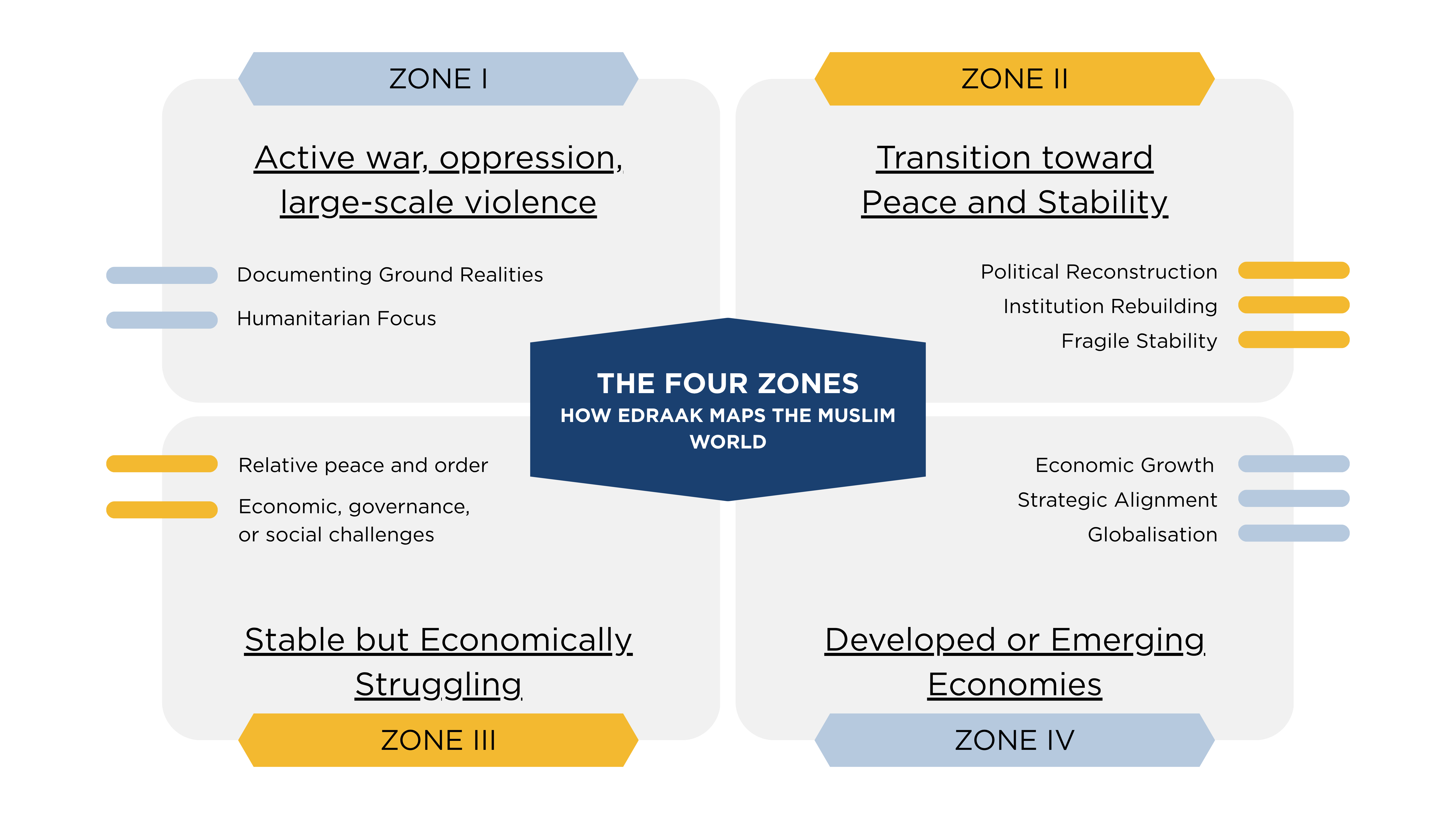 We organise the Muslim-majority countries into four zones as per their current conditions of conflict, transition, stability, and development.